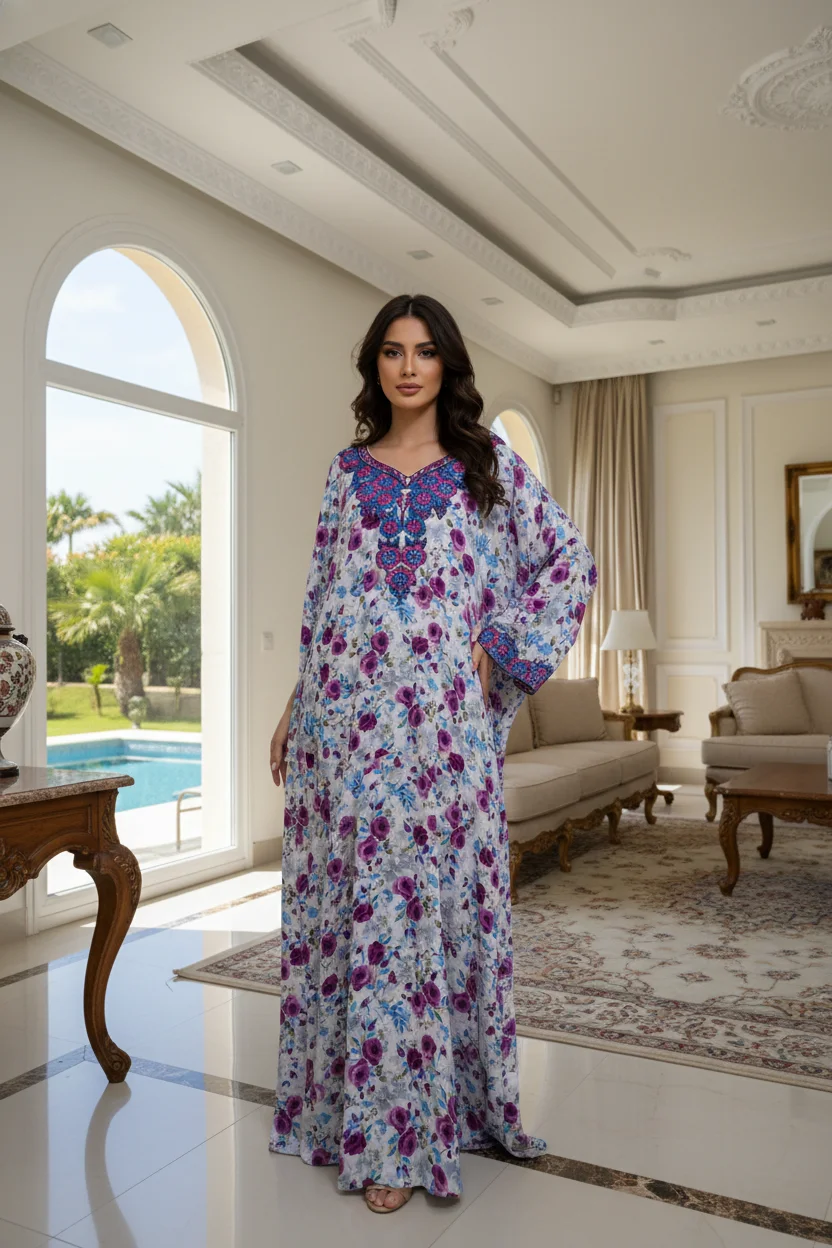 Step into a feminine ready-to-wear look with this high-quality tailored mukhawar in Indonesian silk, featuring an elegant standard design with adjustable side ties that allow you to define the waist easily and enhance your silhouette gracefully.