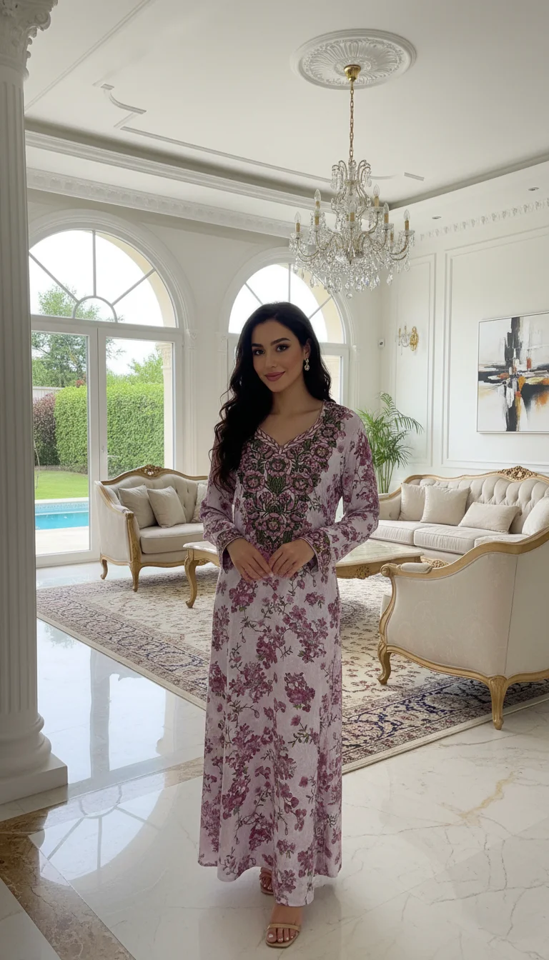 Step into a feminine ready-to-wear look with this high-quality tailored mukhawar in Indonesian silk, featuring an elegant standard design with adjustable side ties that allow you to define the waist easily and enhance your silhouette gracefully.