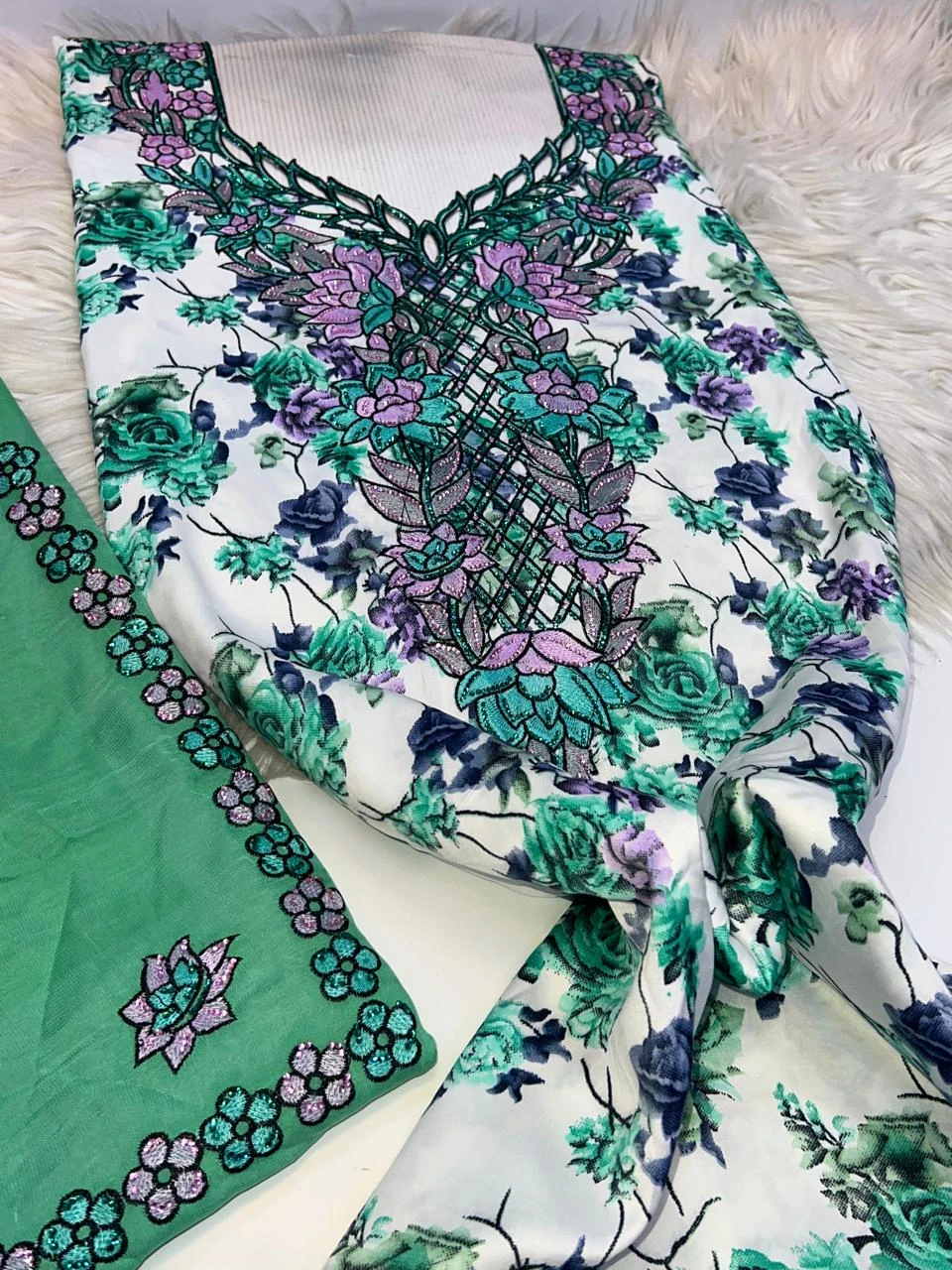 Shine with a complete and elegant look with this luxurious, high-quality makhwar, featuring a distinctive pattern that adds a touch of uniqueness and sophistication. It comes with a matching shawl that completes the look and gives you a refined feminine presence, perfect for special occasions and elegant gatherings.
