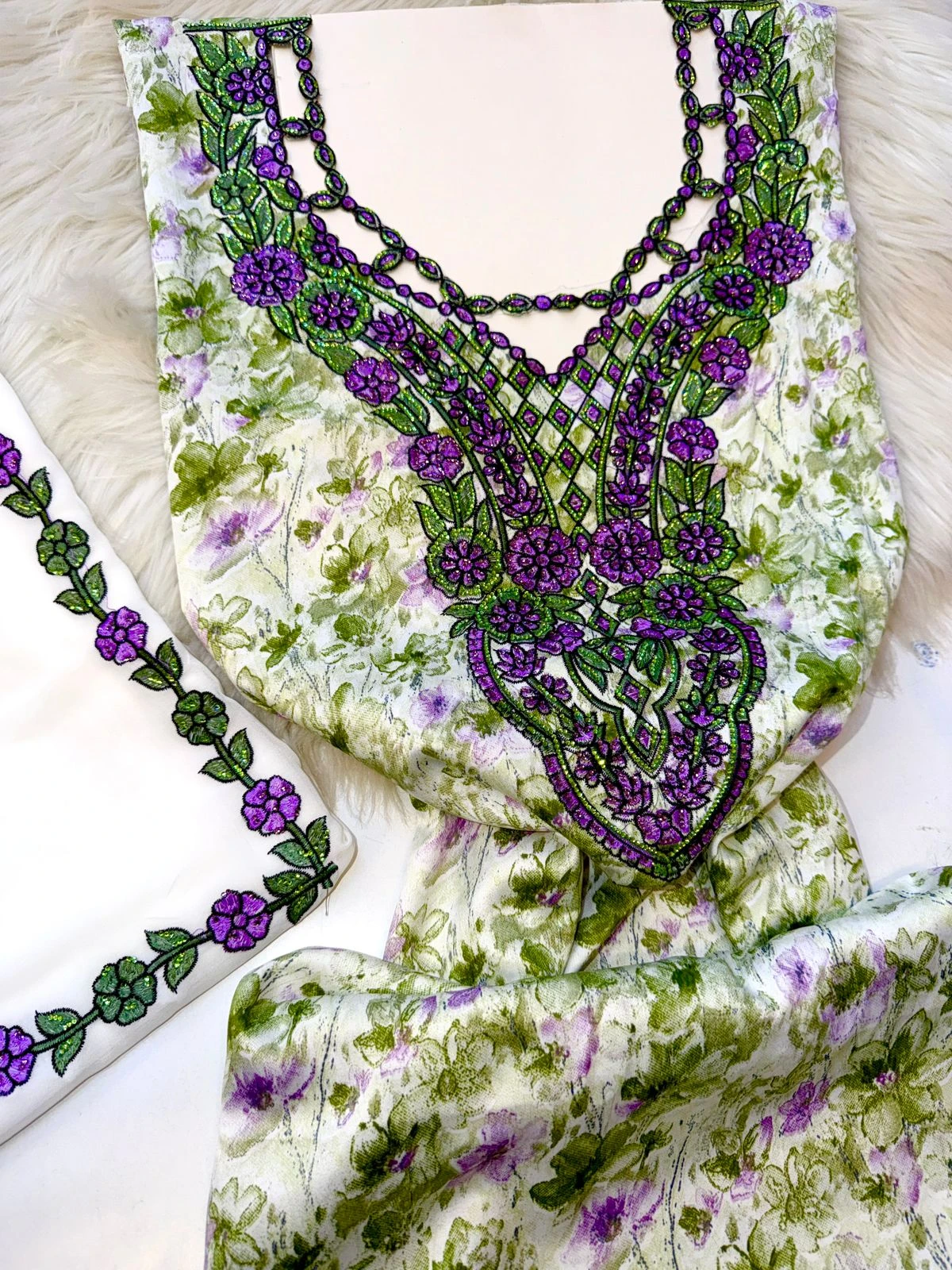Shine with a complete and elegant look with this luxurious, high-quality makhwar, featuring a distinctive pattern that adds a touch of uniqueness and sophistication. It comes with a matching shawl that completes the look and gives you a refined feminine presence, perfect for special occasions and elegant gatherings.