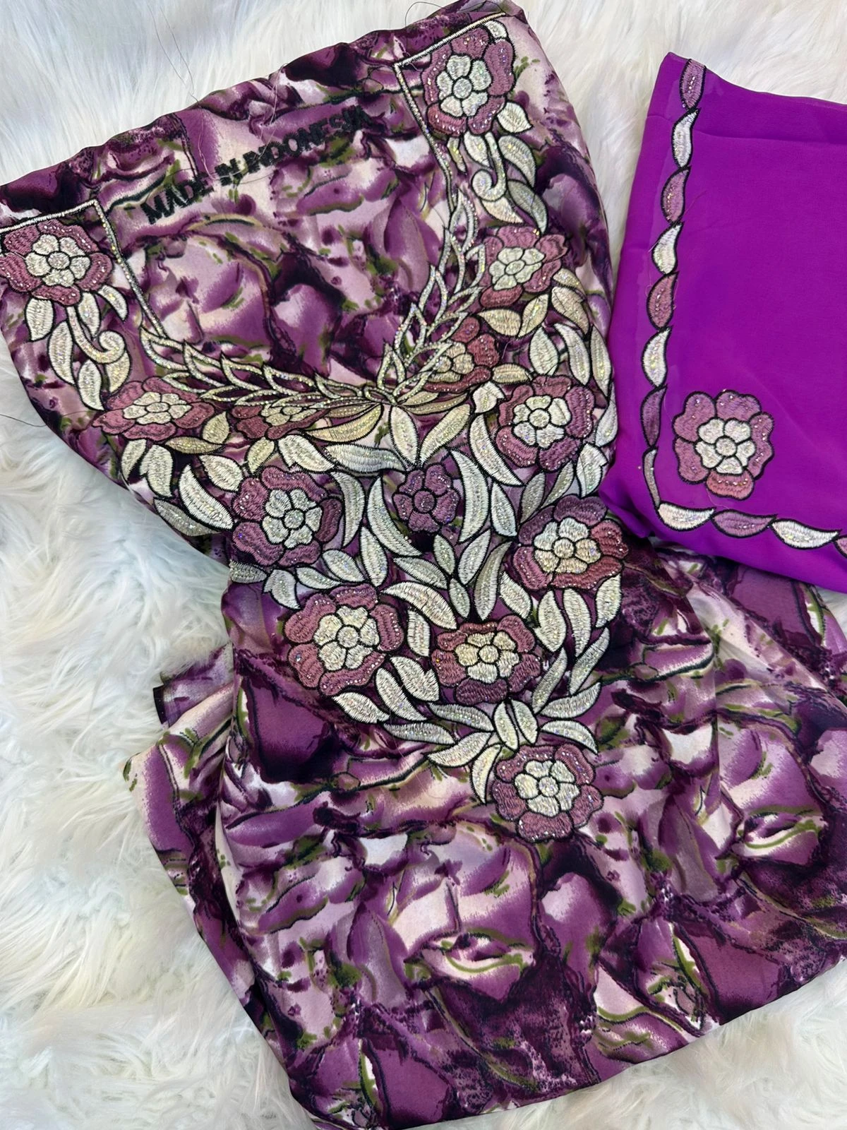 Shine with a complete and elegant look with this luxurious, high-quality makhwar, featuring a distinctive pattern that adds a touch of uniqueness and sophistication. It comes with a matching shawl that completes the look and gives you a refined feminine presence, perfect for special occasions and elegant gatherings.