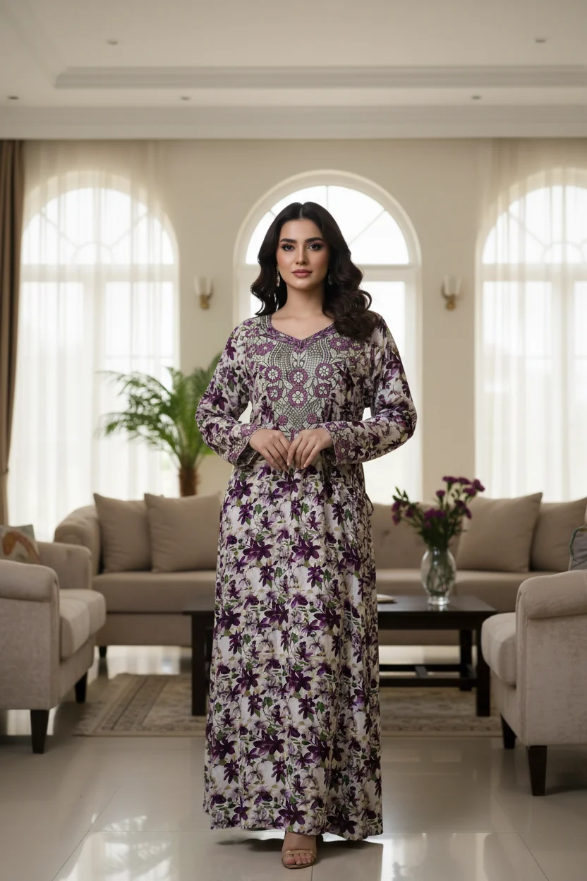 This mukhawar comes ready to wear in a free size, giving you flexibility and comfort to adjust the waist to your preference, with a matching shawl that completes the look with a subtle touch of luxury.