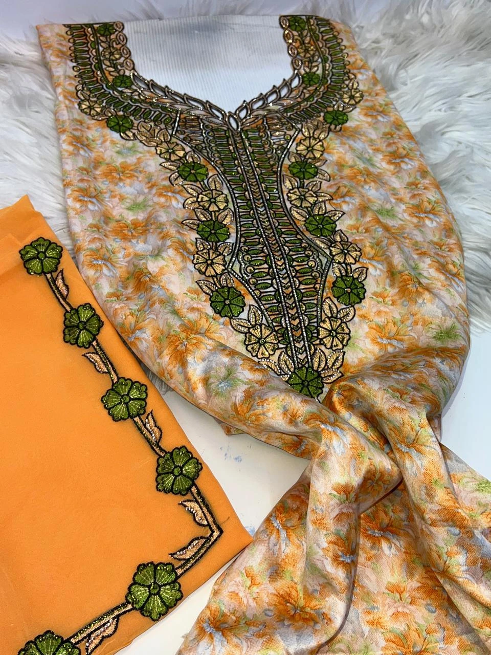 Shine with a complete and elegant look with this luxurious, high-quality makhwar, featuring a distinctive pattern that adds a touch of uniqueness and sophistication. It comes with a matching shawl that completes the look and gives you a refined feminine presence, perfect for special occasions and elegant gatherings.