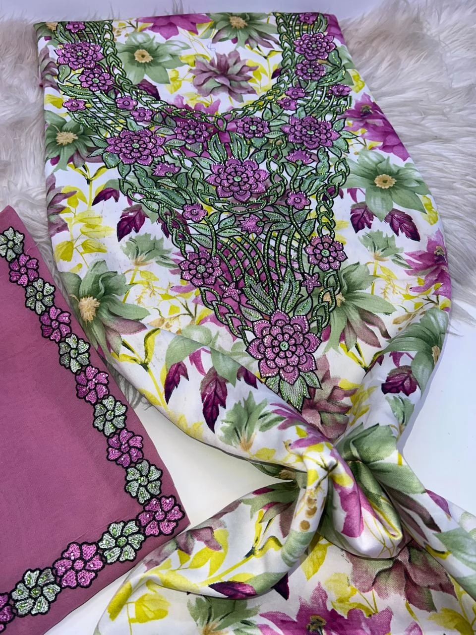 Shine with a complete and elegant look with this luxurious, high-quality makhwar, featuring a distinctive pattern that adds a touch of uniqueness and sophistication. It comes with a matching shawl that completes the look and gives you a refined feminine presence, perfect for special occasions and elegant gatherings.