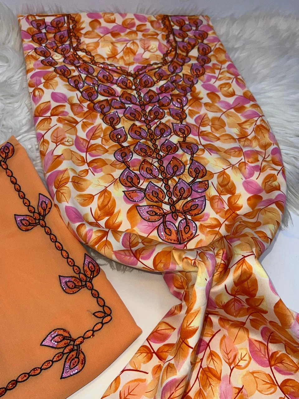 Shine with a complete and elegant look with this luxurious, high-quality makhwar, featuring a distinctive pattern that adds a touch of uniqueness and sophistication. It comes with a matching shawl that completes the look and gives you a refined feminine presence, perfect for special occasions and elegant gatherings.