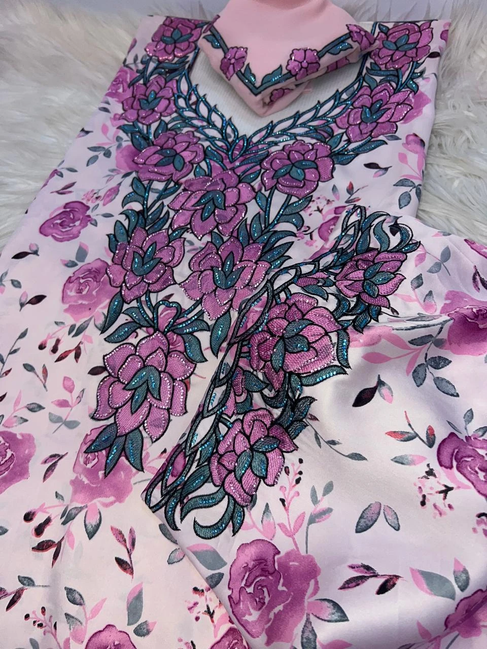 Shine with a complete and elegant look with this luxurious, high-quality makhwar, featuring a distinctive pattern that adds a touch of uniqueness and sophistication. It comes with a matching shawl that completes the look and gives you a refined feminine presence, perfect for special occasions and elegant gatherings.