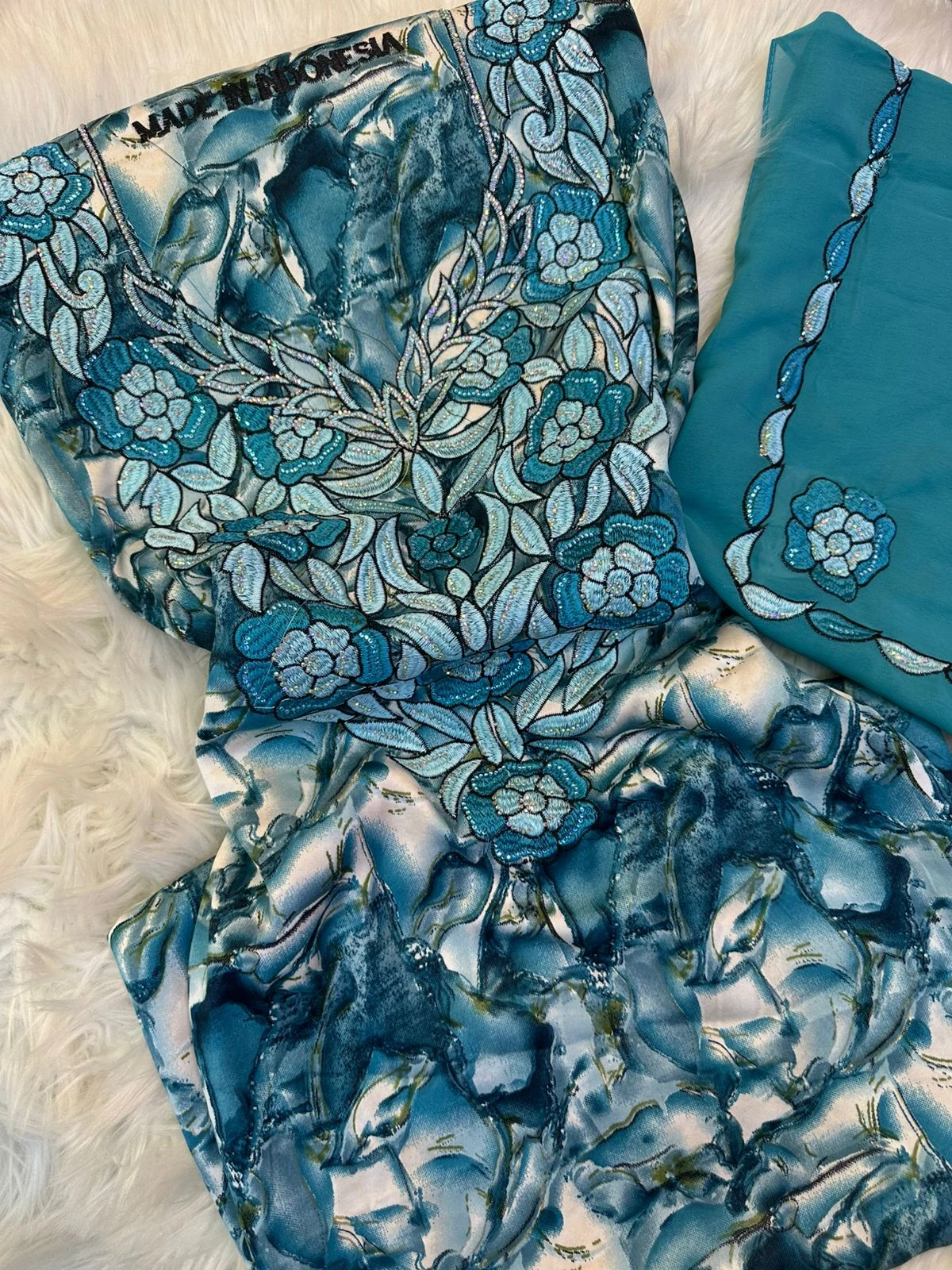 Shine with a complete and elegant look with this luxurious, high-quality makhwar, featuring a distinctive pattern that adds a touch of uniqueness and sophistication. It comes with a matching shawl that completes the look and gives you a refined feminine presence, perfect for special occasions and elegant gatherings.